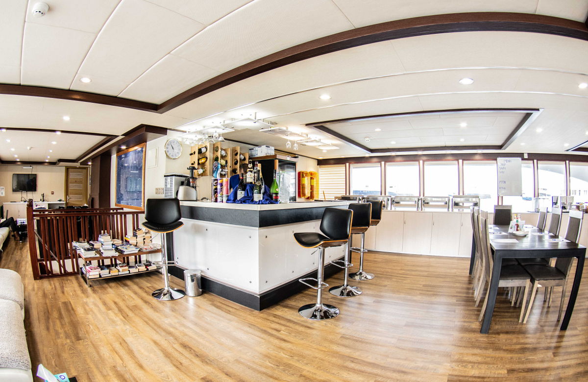 - Main deck: Air-conditioned lounge; comfy sofas, TV, book, music and movie library, board games, dining area and internationally stocked bar. Teak deck with lounge area.